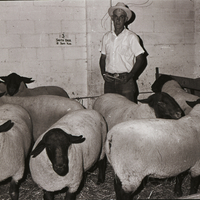 - A man wearing a cowboy hat stands inside a sheep pen of top rams at a ram sale. On the back wall is a sign that reads "3 Smith Bros. 10 Suffolk yearlings."