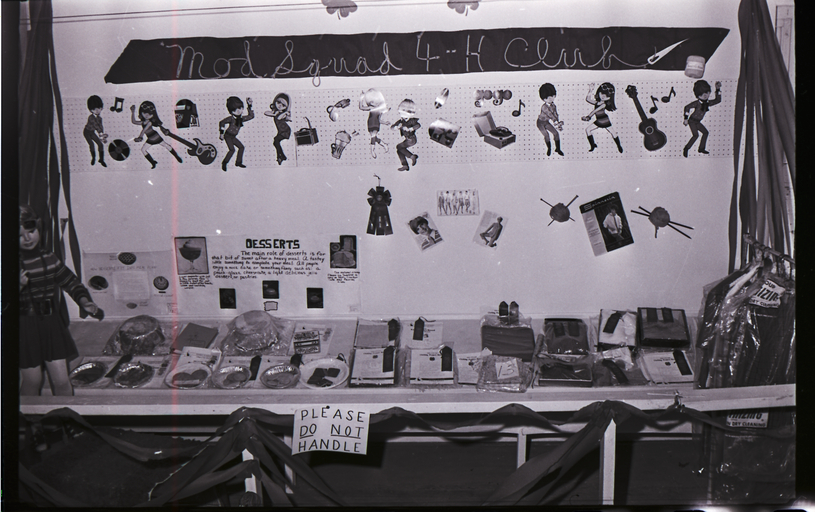 A booth for the Mod Squad 4-H Club is on display at the Jerome County Fair. The top of the display has a sign reading "Mod Squad 4-H Club" and a doll stands on the side of the display as a decoration. On the display is an informative sign about desserts, and below the sign several dessert food items are on display on plates. On the other side of the display are some yarn and knitting needle decorations, and on the table below are several folded clothing items. Several of the items on the display have award ribbons.