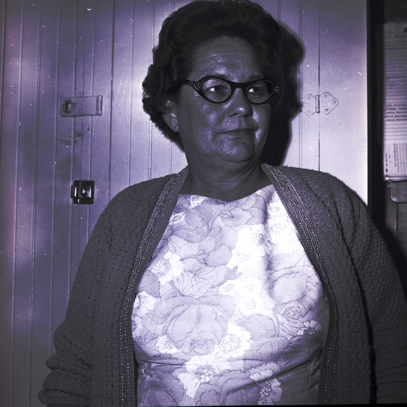 - Mrs. Elwood McCauley, superintendent of the 4-H Girls Club for the Twin Falls County Fair, stands in front of a locked storage cabinet. She is wearing a floral-print blouse and a sweater.