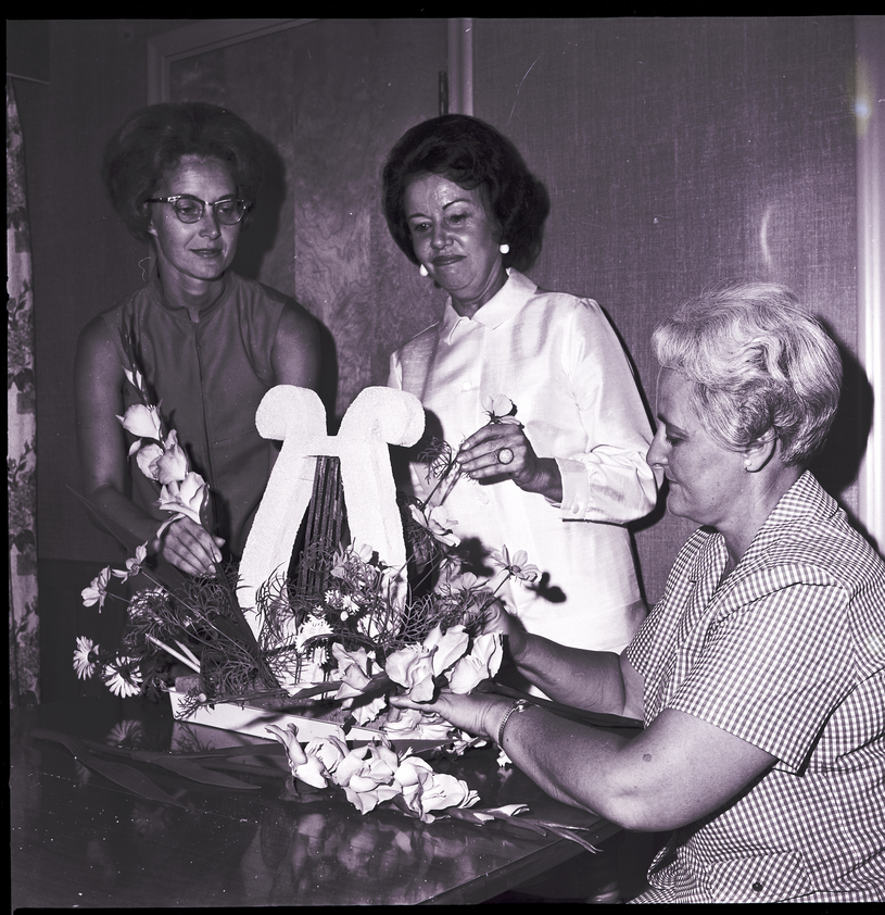 Announcing plans for the Twin Falls Music Club's annual Garden Membership Tea to be held at the Twin Falls YM-YWCA and hosted by the unit's past presidents are, from left to right, Mrs. Don Heller, treasurer of the past president's group; Mrs. Clayta Christensen, decorations chairman; and Mrs. John Birrell, president of the past president's group. The members work on a centerpiece for the event that features a small lyre sculpture surrounded by an arrangement of flowers.