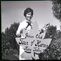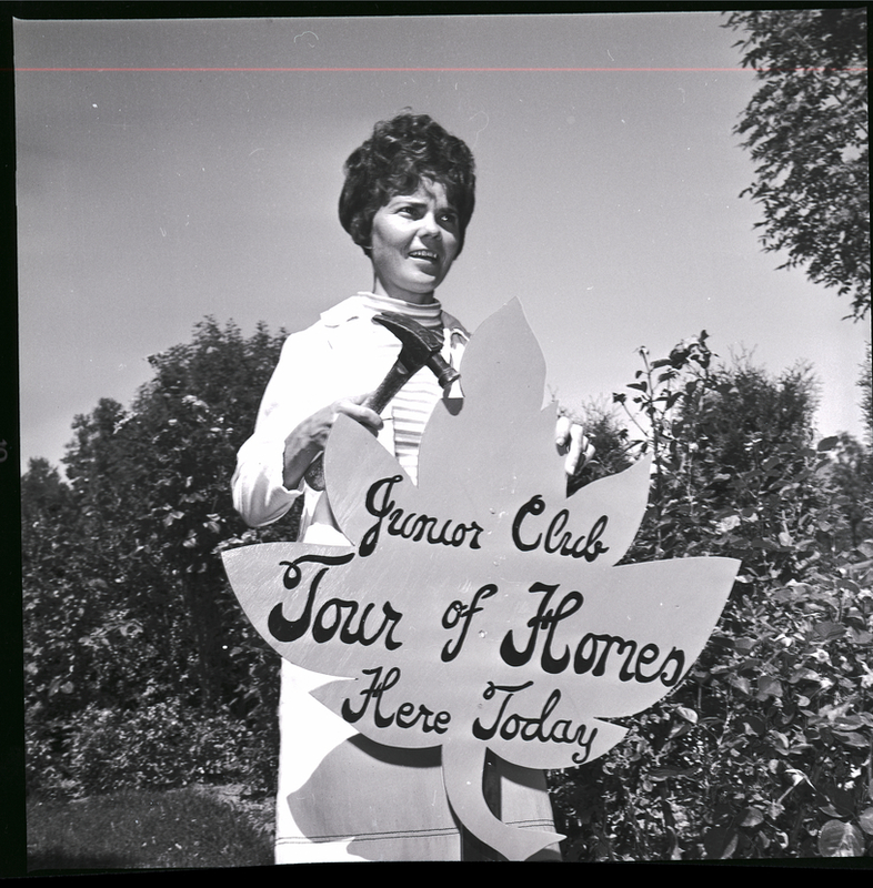 Mrs. William Routh, head hostess at the Jerry Shane home for the upcoming Tour of Homes, holds up a leaf-shaped sign that reads "Junior Club Tour of Homes Here Today" in one hand and a hammer in the other hand. Behind her are several bushes.