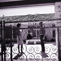Wrought iron gates open onto the open courtyard at the home of Mr. and Mrs. Harry F. LeMoyne. Visiting in the courtyard with Mr. LeMoyne is Mrs. Jerry Meyerhoeffer, Junior Club hostess, who will head the tour at the LeMoyne home during the upcoming Tour of Homes. On the patio behind them is a fountain, and the side of the house is seen beyond it.