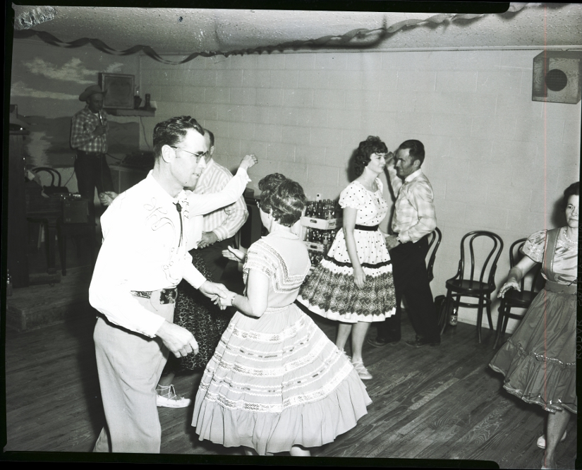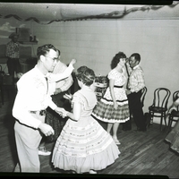 Dancing at a practice square dance session held at the Bairdatorium are Mr. Pat Warren and Mrs. Fred Shobe, foreground. In the background from left to right are Mrs. Joe Gibbs, Mr. Fred Shobe, Mrs. Larry Sabin, Manley Hansen, and Mrs. Pat Warren. The women are dressed in full skirts. The caller, Bill Cofield, dressed in a cowboy hat and plaid shirt, is seen holding a microphone in the background. Streamers decorate the ceiling.