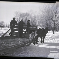 A hay wagon mounted on skis is hitched to two horses. A child in a coat and a cowboy hat, Mike Robinson, holds the reins. Another child in a hooded coat, Holly Robinson, sits off the side of the hay wagon and hangs to a brace. A dog stands behind her. The father, Bruce Robinson, and another man, both dressed in coats and cowboy hats, stand on the back of the hay wagon. Hay covers the bottom of the wagon, and one of the men is holding a pitchfork. Snow covers the ground. A house with a roof covered in snow, barren fields, and bare trees are seen in the background.