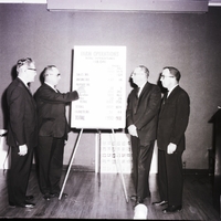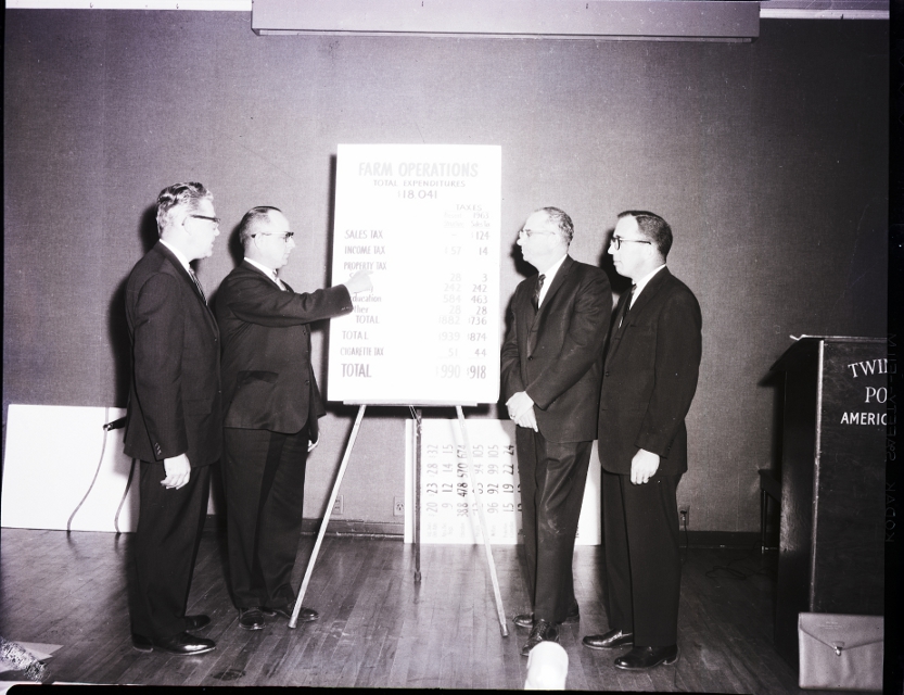Charts were used to demonstrate trends in Idaho general fund expenditures during recent bienniums and to show the pressures for increases, by four speakers who presented talks in Twin Falls on the Idaho tax structure. The report reads "Farm Operations Total Expenditures $18,041" and shows various tax totals. The speakers are, from left to right, William Grange, secretary-manager