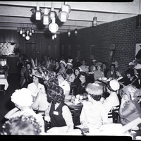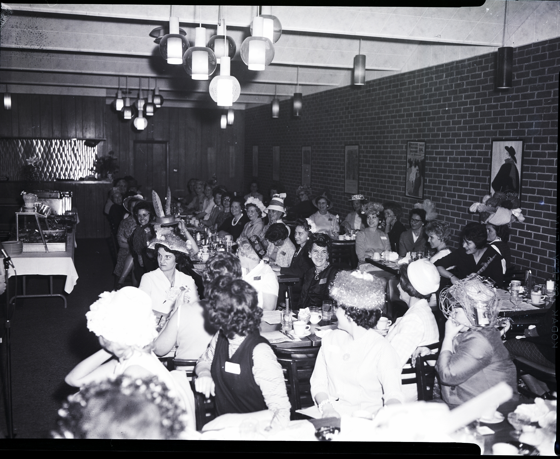 Enjoying a luncheon and admiring the many unusual and unique hat creations are members of the Welcome Wagon Newcomers Club at the April Fool's Day luncheon meeting held at the Depot Grill Caboose room. On the tables are food and coffee. A buffet table of food and plates is visible in the background. Several art prints hang on the brick wall. A microphone is visible on the left in the foreground.