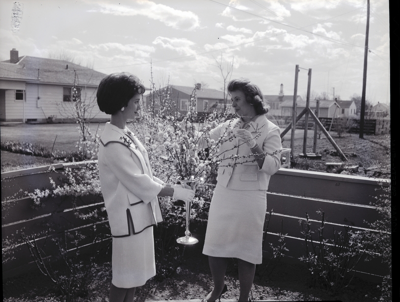 Preparing a floral arrangement are Mrs. William Davis, left, and Mrs. Harold Gerber, right,co-chairmen of the annual Junior Club May Tea. They are wearing dress suits and gloves. Mrs. Davis holds a tall vase filled with flowering branches of blossoms. Mrs. Gerber is arranging the branches in the vase. A fence surrounds the yard, and beyond it other houses and backyards are visible in the background.