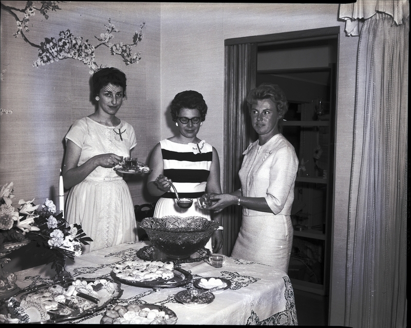 Serving punch at the Junior Club May Tea is Mrs. Richard Schultz, outgoing treasurer, center, to Mrs. Warren Skinner, outgoing vice president, right, and Mrs. Pat Fleenor, projects chairman, left. On the table are several platters of cookies and pastries, a punch bowl, and a centerpiece of flowers framed by two candles. The wallpaper behind the women has a pattern of tree branches covered in cherry blossoms. The women are wearing dresses, and Mrs. Fleenor has a veiled hat.