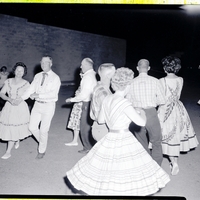 - Four men and four women in full skirts square dance outside together prior to the Idaho State Square Dance Festival. A group of three woman stand on the sidelines watching. A little girl and little boy dance together to the right, behind the square dancers.