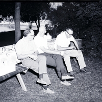 From left to right, Max Brown, Dr. George Rush, and Paul Beck sit on a picnic table bench at Dierkes Lake at a Supper Club barbecue. Dr. Rush holds a cup as he talks with Mr. Brown. The table is covered in a table cloth, and on the table are plates, silverware, condiments, and a cooler. Some picnic baskets are sitting on the table benches. Dierkes Lake can be seen in the distance behind the men. Several trees and bushes surround the area.
