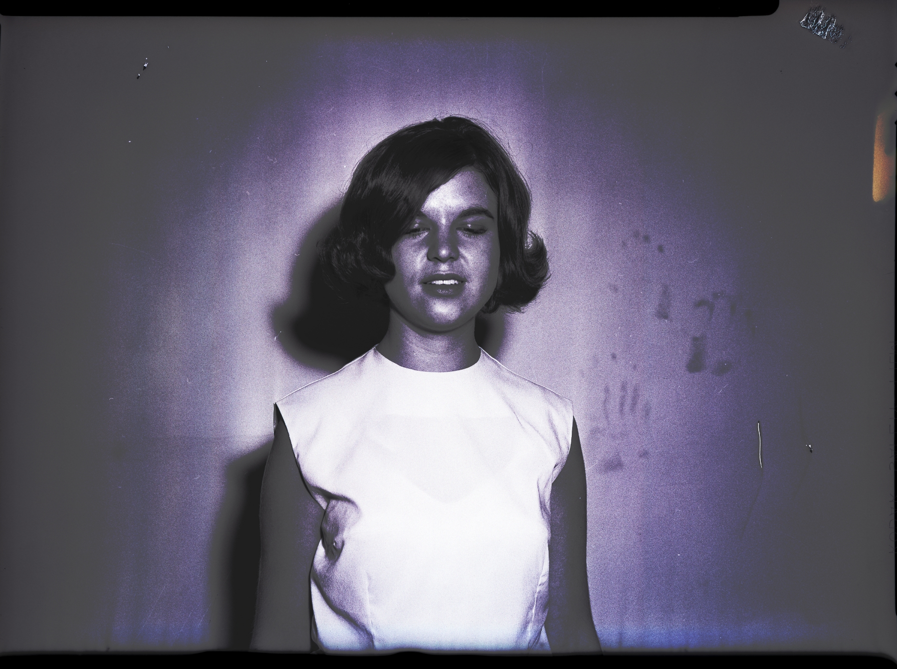 - Carol High, dressed in a white shirt and dark skirt, shows off her short flipped bob hairstyle from a front view.