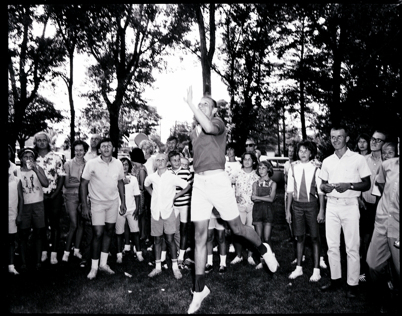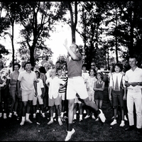A young man in a polo shirt and shorts jumps up to catch a Frisbee at the 18th Annual BPOE picnic. A group of people are behind him, watching. In the background behind the gathering of men, women, and children, the trees of the fairgrounds and some parked automobiles (cars) are visible.