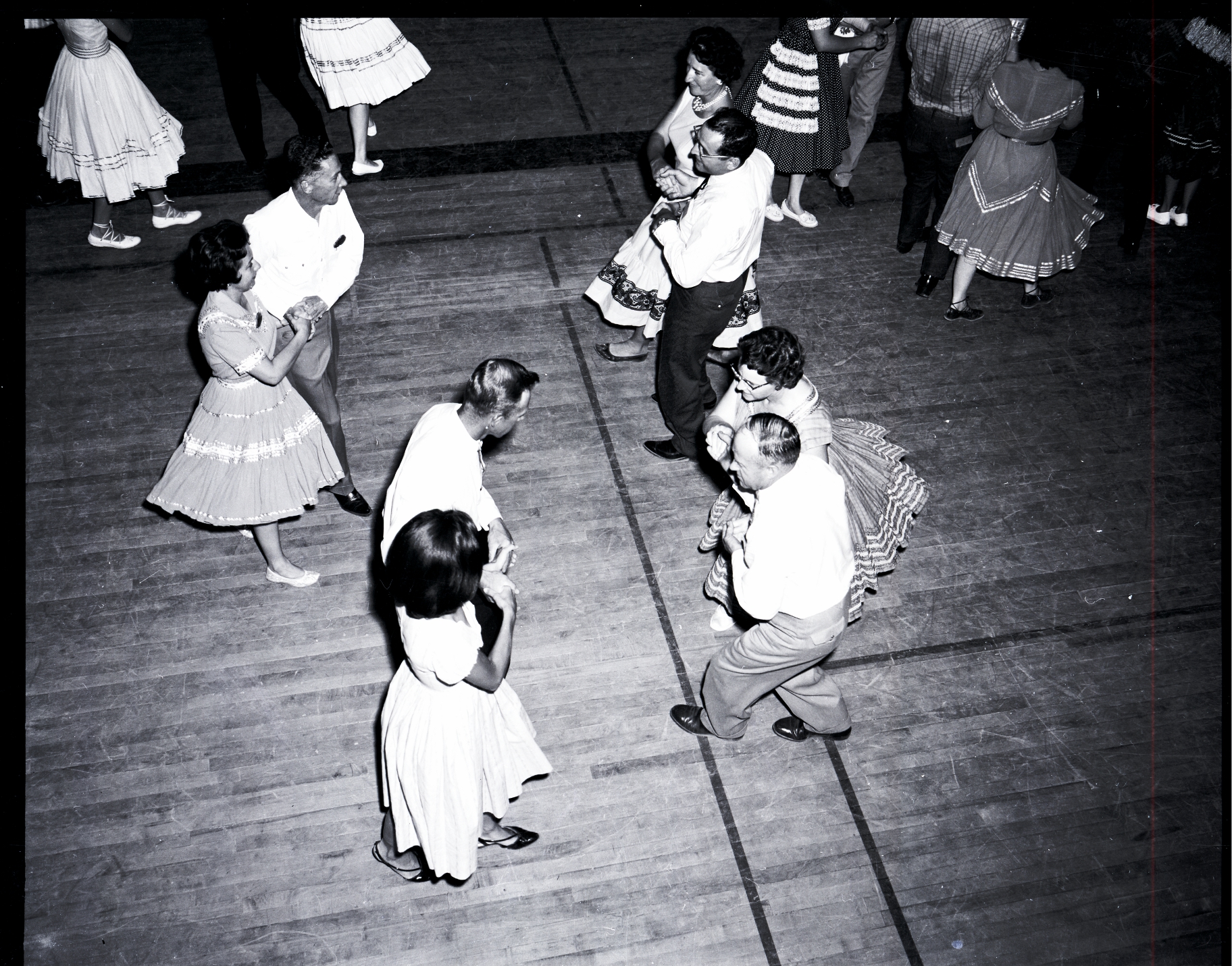 A group of square dancers dance in the Twin Falls High School gymnasium at the Idaho State Square Dance Festival. Four men and four women in full skirts dance as couples in the center of the floor, and other couples are seen dancing in the background around them.