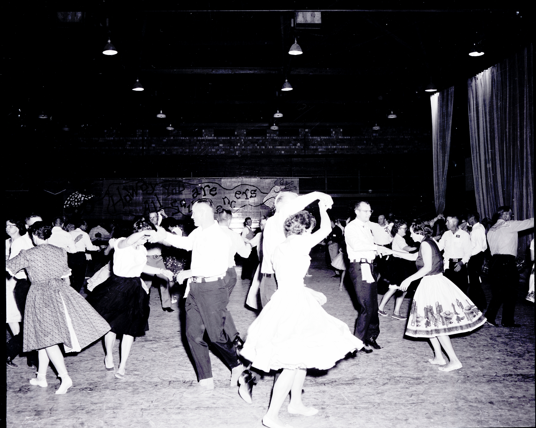 A group of square dancers dance in the Twin Falls High School gymnasium at the Idaho State Square Dance Festival. The women are dressed in full skirts. Behind the group of dancers is a large banner reading "Howdy you are all square dancers."