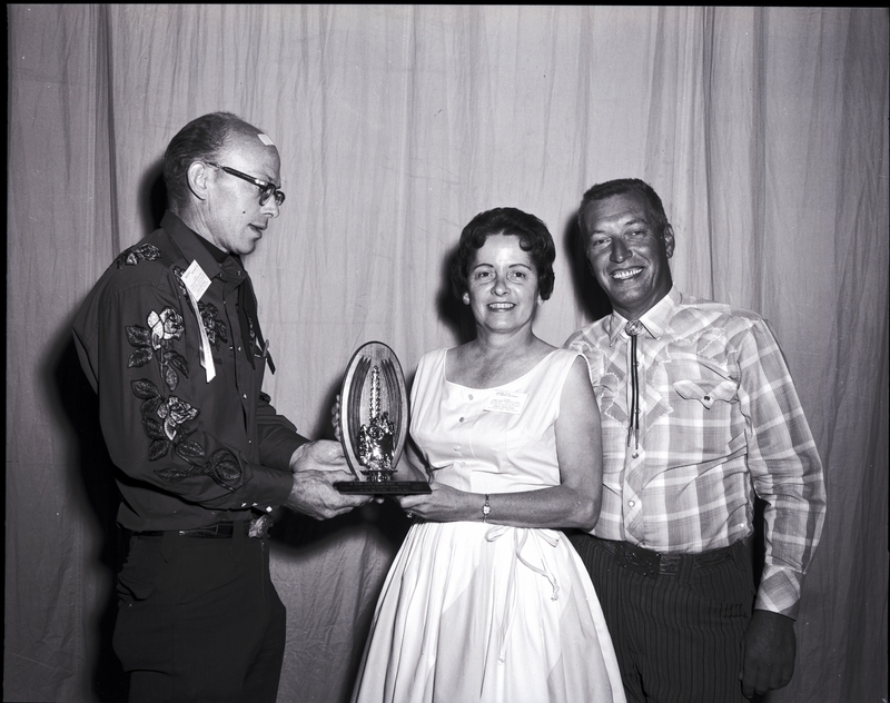 Ernie Davis presents the out-of-state trophy to Mr. and Mrs. Robert Bliss from Encino, Califorina, at the Idaho State Square Dance Festival held at Twin Falls High School. Mr. Davis is wearing a name tag reading "Ernie Davis, Twin Falls, Idaho," and an award ribbon reading "Formation." Mrs. Bliss is wearing a white dress with a full skirt and a name tag that reads "Rosemary Bliss, Los Angeles, California." Mr. Bliss is wearing a plaid shirt and striped pants. The trophy reads "1st Idaho State Square Dance Festival, Largest Out of State Area Attending, July 31 - Aug 1-2, 1964, Twin Falls, Idaho."