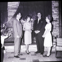 Discussing progress of the College of Southern Idaho during an open house in the social hall of the First Presbyterian Church, are, from left to right, Dr. Don Keith, dean of men, Probate Judge Zoe Ann Shaub, Dr. James L. Taylor, college president, and Mrs. Eldon Evans, whose husband is a member of the board of regents. The men are wearing suits and ties and the women are wearing dresses. Behind them is a fireplace, and a bouquet of flowers is on the mantle. A large vase of flowers is to the side, and a chair to the other side.