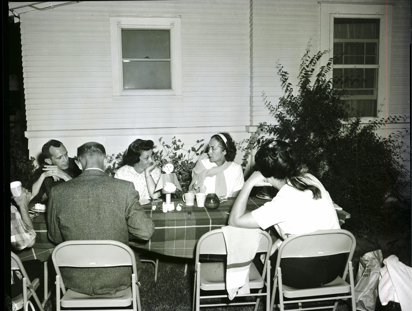 The Art Guild of the Magic Valley gathers in the backyard of the home of Mr. and Mrs. Earl Peck for a barbecue marking the end of the fiscal year. The men and women are seated in folding chairs at a long table covered in a plaid table cloth. Plates, silverware, cups, and a centerpiece of a doll holding a painter's palette are on the table. A candle and some loose flowers also on the center of the table. A pack of cigarettes sits on the table beside of the women. The houses and some bushes are in the background.