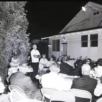 The Art Guild of the Magic Valley gathers in the backyard of the home of Mr. and Mrs. Earl Peck for a barbecue marking the end of the fiscal year. The men and women are seated in folding chairs at long tables covered in white table cloths. Ashtrays, cups, and a centerpiece of a doll holding a painter's palette are on the tables. A fir tree is to the side. The house is in the background.
