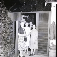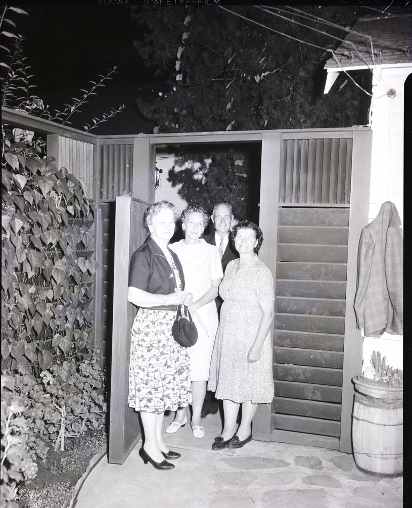 The Art Guild of the Magic Valley gathers in the backyard of the home of Mr. and Mrs. Earl Peck for a barbecue to mark the end of the fiscal year. From left to right are Mr. and Mrs. Don Brannen, Mrs. Walter Hann, and Mrs. Lillian Voellers. The women are wearing dresses and Mr. Brannen is wearing a suit and tie. Ivy vines are draped over the side wall. To the other side of the doorway, a plaid jacket hangs on the side of the house, and a barrel planter of cacti sits below it. A fir tree is in the background.