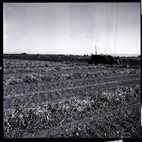- A field of beans is cut into windrows. A tractor sits at the edge of the field. Some trees are seen far in the background, on the horizon.