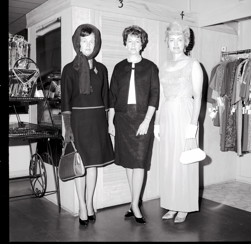 Mrs. Jack Shaw, Mrs. Gordon Cox, and Mrs. C. A. Perkins model fashions for a fashion fair for women attendees of the Utah-Idaho Kiwanis District Convention. All fashions will be furnished by The Paris. Mrs. Shaw is dressed in a skirt and shirt, long gloves, a scarf draped over her head, and is holding a purse. Mrs. Cox is dressed in a skirt, shirt, and jacket. Mrs. Perkins is dressed in a long evening gown, short white gloves, and is holding a purse. Behind them are two dressing rooms, and to the sides is a display of jewelry and several shirts hanging from hangers.