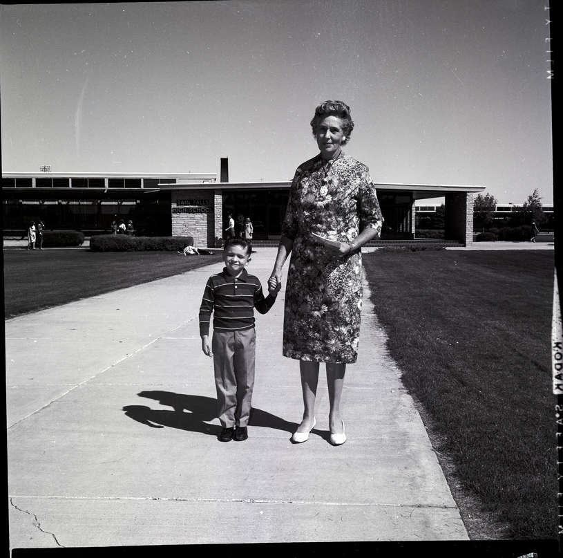 Mrs. Loyd Wright stands outside of Twin Falls High School with a class catalog in her hand, in preparation for enrolling at CSI. Her young grandson Douglas Wright stands beside her, holding her other hand. Several high school students are walking in the background.