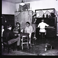 A group of people sit around a table drinking bottles of Coca-Cola at a Walther League Convention held at the Memorial Lutheran Church. The theme of the convention was "Pioneers for Christ." The room is decorated to look like a saloon, using empty bottles on top of a cabinet and fishing nets draped from the walls. A piano is against the wall, and a girl in a cowboy hat is playing it. Another girl in a cowboy hats stands beside her, holding a drink. On top of the piano are some fake cowboy hat decorations that read "Twin in '65." An aerial photograph hangs on the back wall.