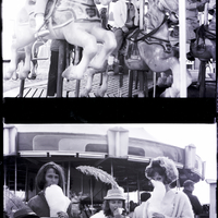 In the top image, from left to right, Becky Johnston, Betty Johnston, and Jana Roesler ride the carousel at the Twin Falls County Fair. In the bottom image, three girls stand in front of the carousel, eating cotton candy. Two of them are wearing embroidered hats with a long feather sticking out of them, and the other girl has rollers in her hair and is wearing a bonnet over them. The center girl has "Peggy" embroidered on her hat, and she's holding a small purse.