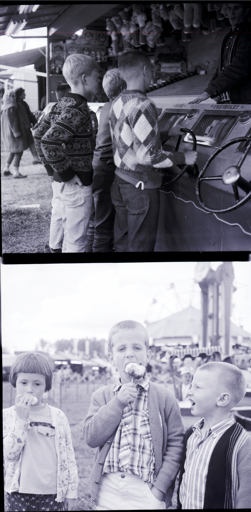A group of young boys play a Nash Chevrolet game at the Midway at the Twin Falls County Fair. A boy holds a steering wheel on the outside of the booth, while a man inside the booth instructs them. Stuffed animals hang from the ceiling of the booth. Some girls can be seen standing in front of a different Midway game booth in the background. In the bottom image, two little boys and a little girl enjoy some fair food. The center boy, dressed in a plaid shirt and sweater, is eating a caramel apple, while the boy to the right watches. The girl on the left, dressed in a shirt and floral print pullover, holds some food to her mouth. The carnival rides, including the large Ferris Wheel, are visible in the background behind them.