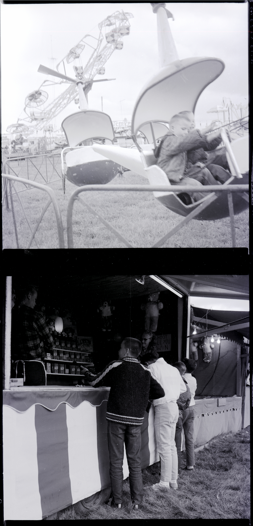 In the top image, two little boys sit inside the car of a carnival ride at the Twin Falls County Fair. Other carnival rides are seen in the background. In the bottom image, a group of boys stand outside a Midway booth. A man and a woman are inside the booth, giving directions. One boy is holding a gun, ready to shoot for prizes. Inside the booth is a wall of boxes of Crackerjacks, and stuffed animals hang from the ceiling.