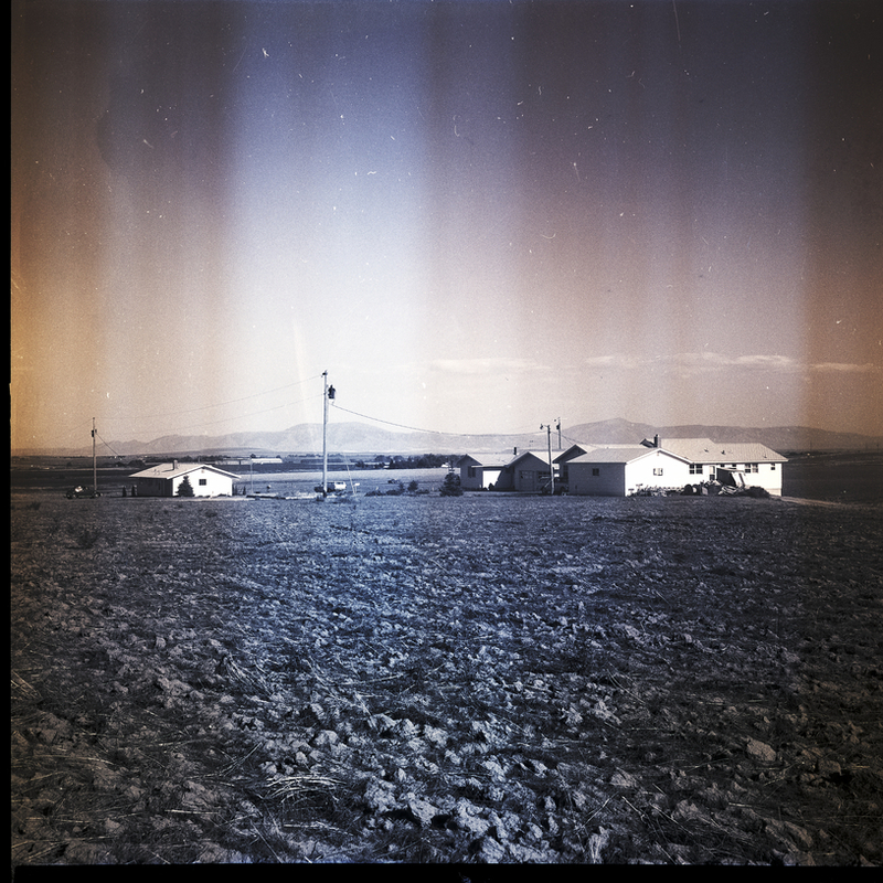 The Star Ranch, Frances Sande's Interdenominational Divine Order complex, located between Hansen and Murtaugh, is seen surrounded by empty fields covered in manure. Several other houses are nearby. A Volkswagen Bug automobile (car) is parked in one of the driveways. A man in a cowboy hat is working in a small garden in the backyard. Fields, trees, and mountains are visible in the distance.