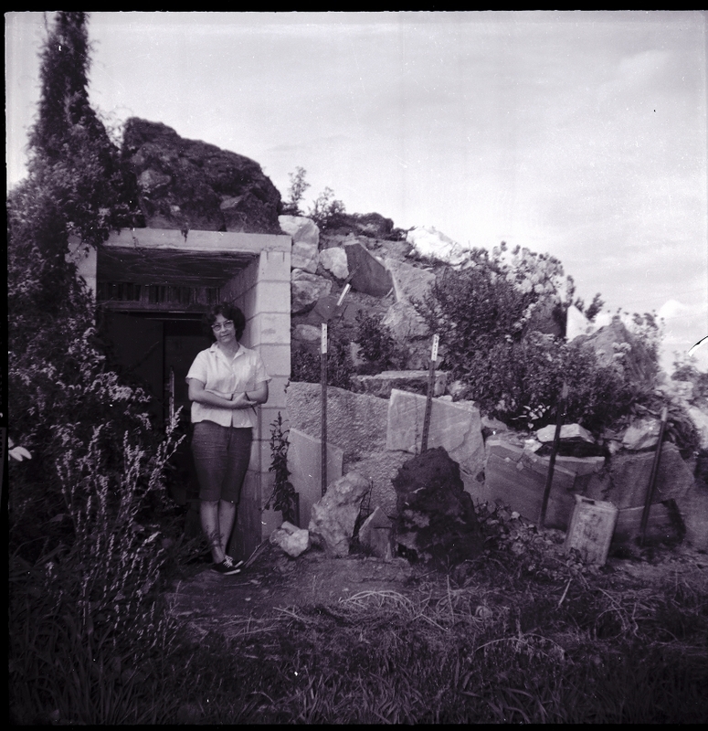 Mrs. Max Dayley stands in the entrance of a fallout shelter. The shelter is dug out of the side of a hill, and lava rocks, plants, flowers, shrubs, and long grass have been used to provide landscaping. The inner shell of the shelter is made of reinforced concrete and concrete blocks, topped by four feet of dirt.