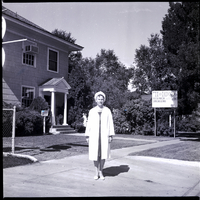 Frances Sande, organizer of the Interdenominational Divine Order, stands outside the I-Do building located on 519 Main Ave. W. in Twin Falls, Idaho. She is dressed in a polka dot dress, white jacket, and a white scarf wrapped around her head. The sign outside the building reads "I-Do Research Specializing, Science Banishes Mystery." Several trees and shrubs surround the building.