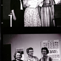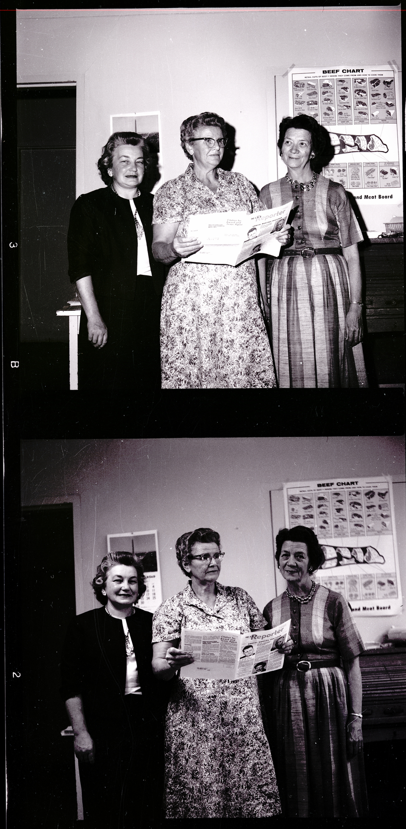 Discussing plans for the Idaho State Homemakers Convention are, from left to right, Mrs. Robert Norris, local chairman; Mrs. J. H. Sharp, county council president; and Mrs. H. A. Childers, South Central District director of the Idaho State Homemakers Council. The convention will be held in Twin Falls. The three women are wearing dresses, and Mrs. Sharp holds a pamphlet that reads "The E. H. E. Reporter Annual Meeting Features. Dr. Bouma Sets Stage for Action. Special Challenge of an Increasing Population" on the front cover and "Citation for Award and Texas Agent. Registration Fee for Annual Meeting" on the back cover. On the wall behind the women are a calendar and a beef chart that reads "Beef Chart, Retail Cuts of Beef -- Where They Come From and How to Cook Them."