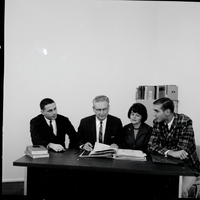 From left to right, Patrick Vecera, Howard Kiehlbauch, Barbara Frederickson, and Daniel Gruener sit behind a desk looking over some books for the mid-management club contests. The four are delegates from the College of Southern Idaho's Mid-Management Club that will compete in state competitions in Boise. A file cabinet with several books on top of it is in the background.