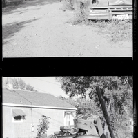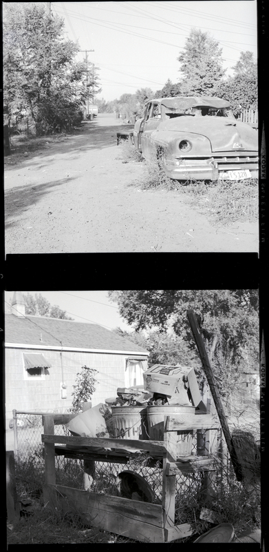 In the top image, an old rusted automobile (car) sits in a pile of weeds in an alley. Fences and trees line the sides of the alley. In the background are some garbage cans and a trailer. In the bottom image, a wooden frame is piled with garbage cans, boxes, and sacks, sitting in some weeds in the alley behind a house. Behind the junk is a chain link fence, a house, and some trees. A cleanup campaign of Twin Falls alleys is planned.