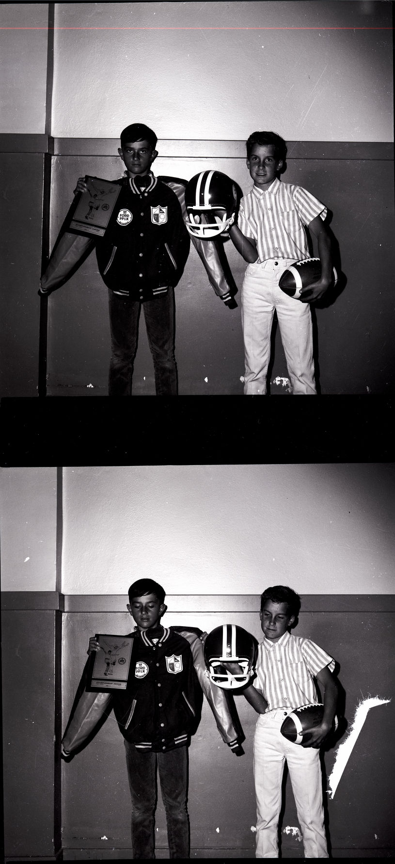 Ralph Pond and Kelly Nealon display the prizes for the Ford Punt, Pass, and Kick Contest. Ralph Pond holds up a jacket and a plaque that reads "Ford PP&K Championship Award First Place 1965, Age 11." Kelly Nealon holds a football helmet and football. The contest was sponsored by Union Motors and the Twin Falls Parks and Recreation Department, and boys between the ages of 8 and 13 may compete.