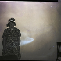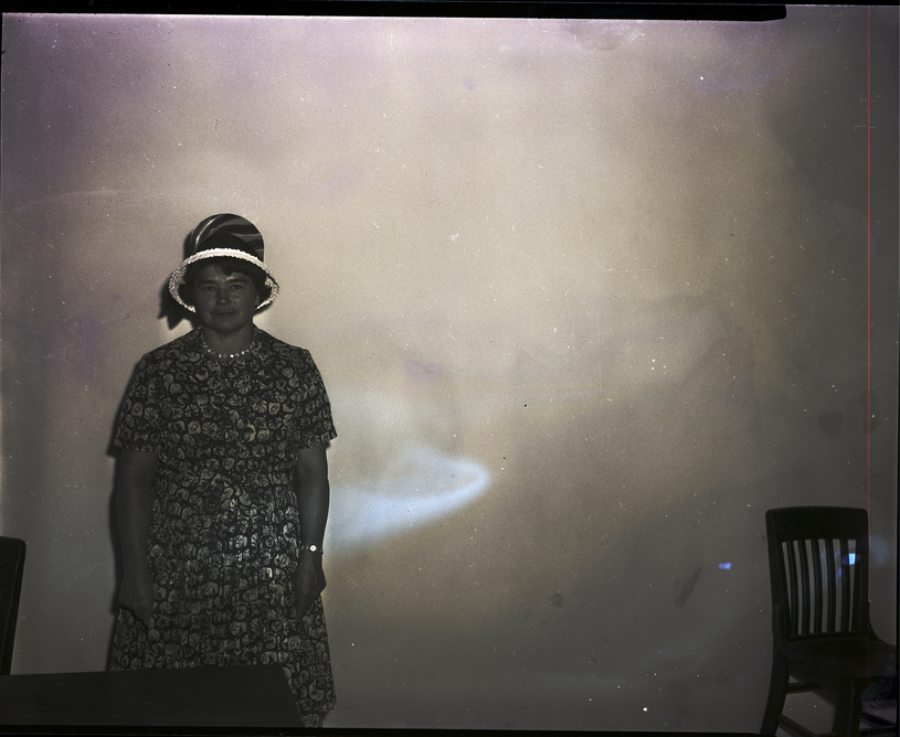 Mrs. Robert Brackett, president of the Twin Falls Baptist Women's Mission Society, stands against a wall. She is wearing a floral print dress and a hat. A table is in front of her, and a chair is in the corner of the room.