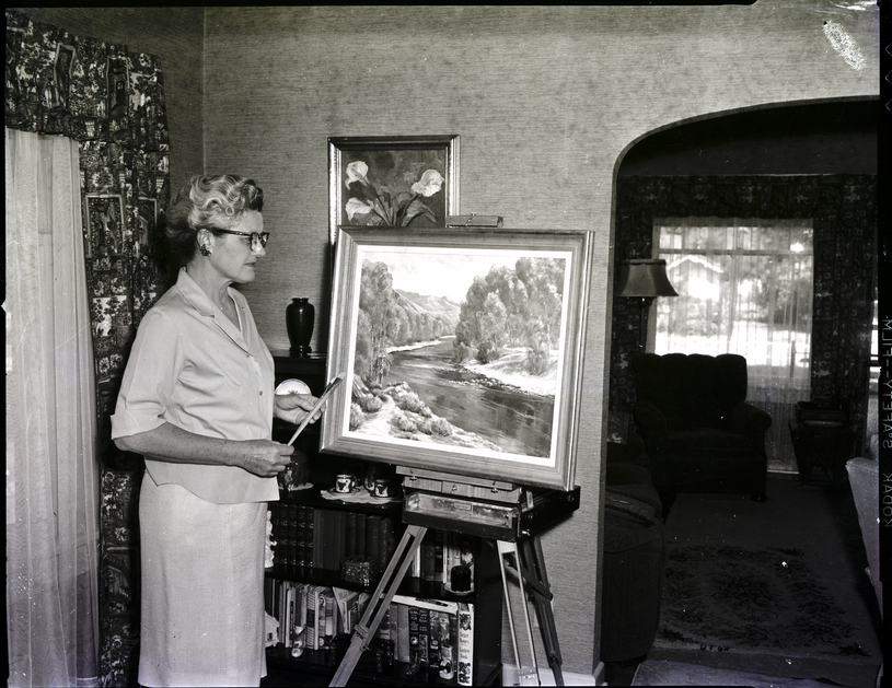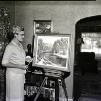 Mrs. Earl Peck, president of the Magic Valley Art Guild, stands in a parlor working on a painting. She is wearing a blouse and skirt and holding some paint brushes, and a landscape painting of a river lined by trees is sitting on an easel in front of her. Behind the easel is a bookcase filled with books and antiques, and a painting of some lilies hangs on the wall above it. Curtains hang over a window behind her. The living room can be seen through an archway to the side.