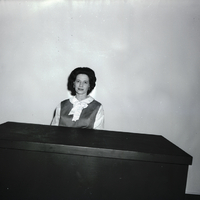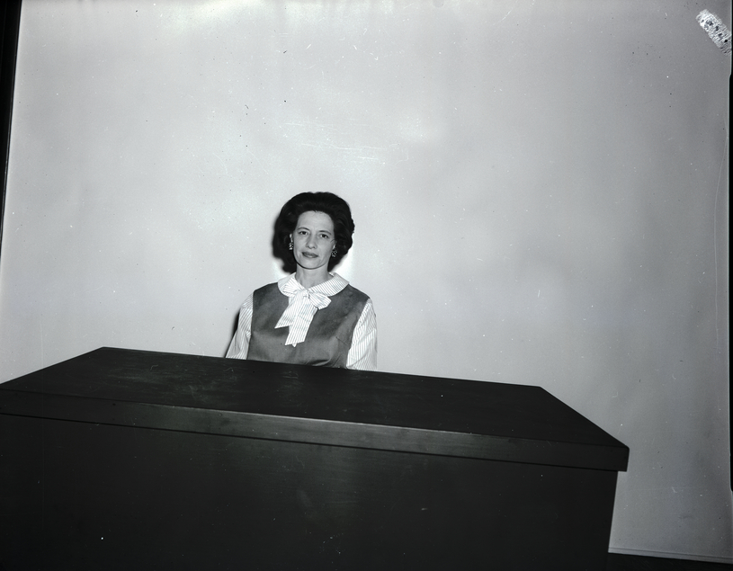 Mrs. Kenneth F. James, president of the Twin Falls Lutheran Women's Missionary League, sits behind a desk. She is wearing a dress with striped sleeves and collar with a wide bow at the neck.