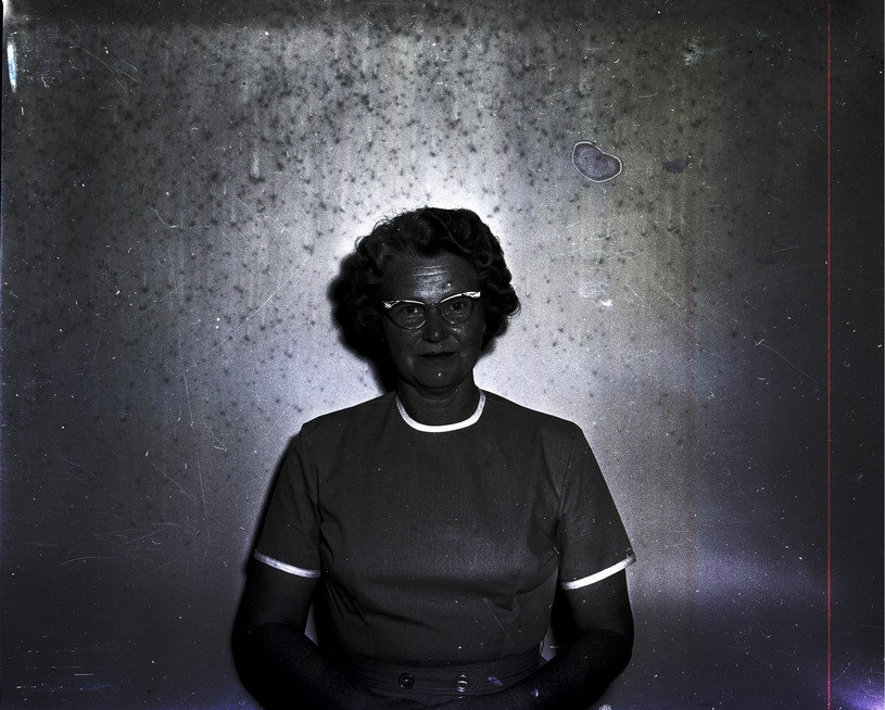 - Mrs. Eldred Taylor, president of the Countryside Flower Club, stands in a hallway. She is wearing a dress.