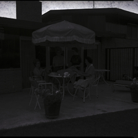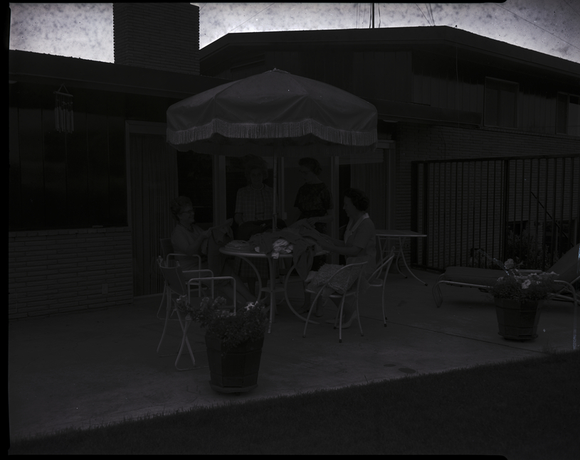 Sitting on the patio at the home of Mrs. Artell Kelly are officers of OES number 29. From left to right are Mrs. Artell Kelly, worthy matron, Mrs. Paul Moseley, secretary, Mrs. Don Kilborn, assistant matron, and Mrs. Eugene Pippitt, project chairman. All the women are wearing dresses. The members prepare for a rummage sale to raise money for furniture for the Masonic Temple Lounge. They are seated around a table with a parasol canopy, which is covered in clothing. Another table, a lounging chair, and some large planters of flowers are on the back porch. The house is in the background behind them.