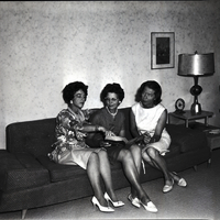 Three members of the League of Women Voters sit on a couch and discuss plans to educate voters. From left to right are Mrs. James Brennan, first vice president, Mrs. Bernard E. Barker, a new member, and Mrs. T. M. Robertson, treasurer. Mrs. Brennan is wearing a blouse and skirt and the other two women are wearing one-piece dresses. On a stand beside the couch is a lamp, a clock, and an ash tray. A framed picture hangs on the wall. A recliner is in the corner.
