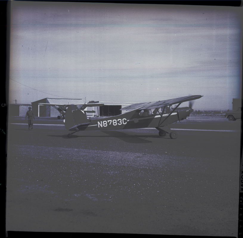 - An airplane for a Civil Air Patrol search and rescue drill sits on the runway at Joslin Field airport in Twin Falls. "N8783C" is painted on its side. A man walks towards the plane. Behind it is another plane and some hangers.