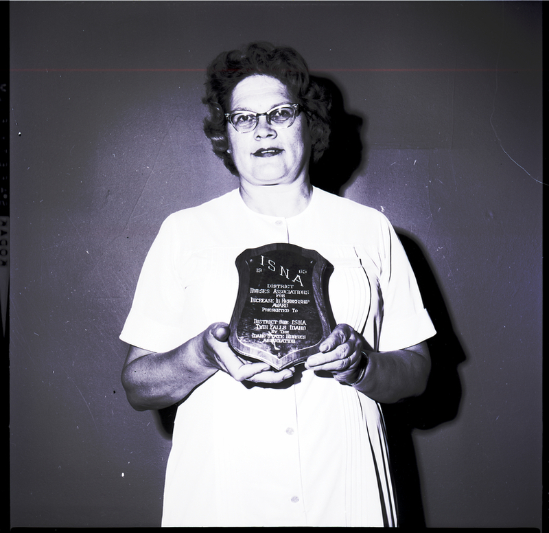 Mrs. R. S. Honderich, president of the local Idaho State Nurses Association, holds an awards plaque received during the Idaho State Nurses Association convention held in Lewiston. The plaque reads "ISNA 1965 District Nurses Associations for Increase in Membership Award Presented to District One ISNA, Twin Falls, Idaho, by the Idaho State Nurses Association." She is wearing a white button-up dress.