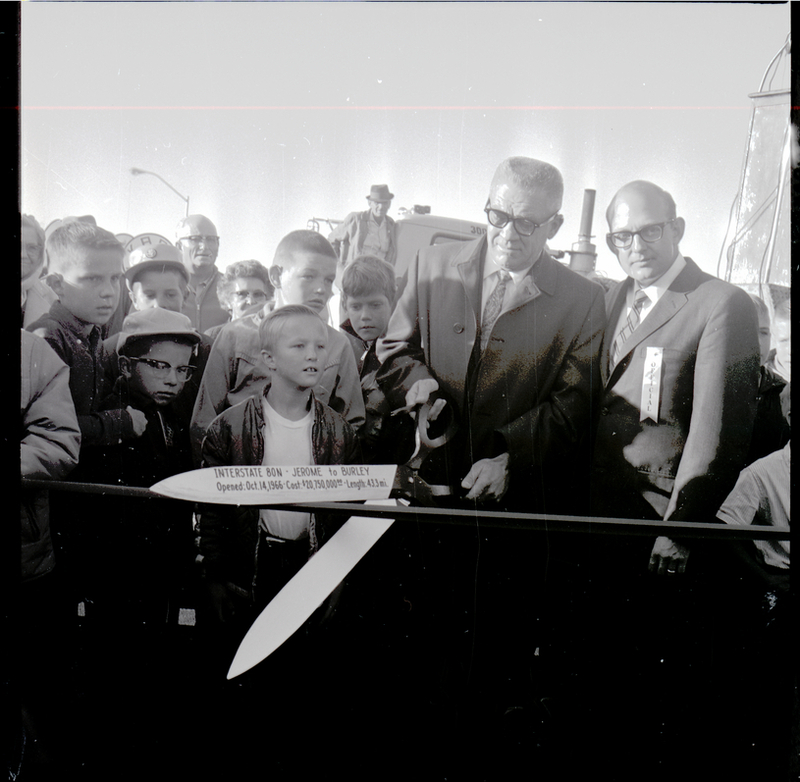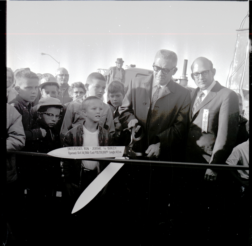 Chairman of the Twin Falls County Commission Morris Carlson, dressed in a suit, tie, and jacket, holds a large pair of scissors that reads "Interstate 80 N - Jerome to Burley Opened Oct. 14, 1966. - Cost: $20,750,000.00 - Length: 43.3 mi." at a ribbon cutting ceremony during the Jerome Road dedication. A man in a suit and tie stands beside him, wearing a ribbon that says "Official." A crowd of men, women, and children have gathered to watch. In the background, a man in a hat stands on a truck to get a good view of the proceedings.