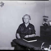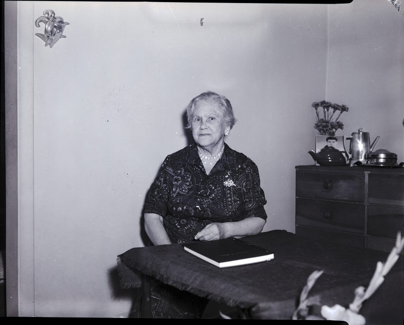 Mrs. Grace Laubenheim, president of the F and M Club, sits behind a table. She is wearing a patterned dress with a pin on the chest. The table is covered in a tablecloth, and a book sits on top of it. In the back corner of the room is a dresser, and on top of it are some teapots, a photograph, and some flowers. A flower ornament hangs on the wall behind her.