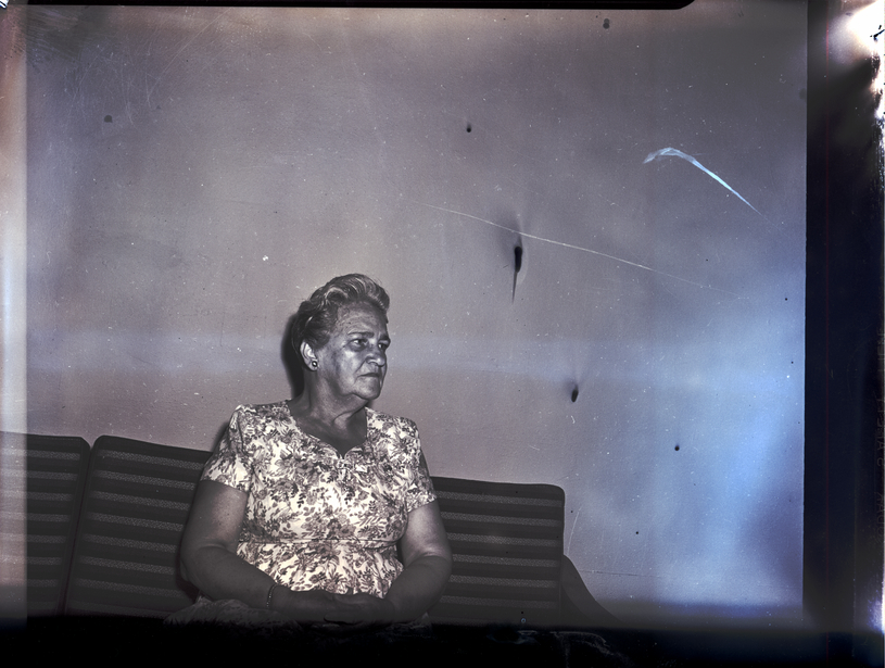 - Mrs. William C. Armga, president of the Past Oracles Club, sits on a couch. She is wearing a floral print dress.