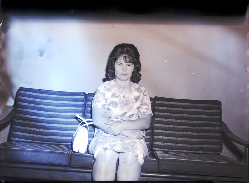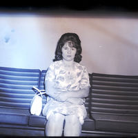 Mrs. Ronnie Pope, president of the Magic Valley Young Wives, sits on a couch. She is wearing a floral print dress. A purse sits beside her on the couch.