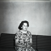 - Mrs. Mary Stearns, president of the Twin Falls Triple Link Club, a subordinate to Primrose Rebekah Lodge No. 76, sits on a couch. She is wearing a floral print dress and a pearl necklace.